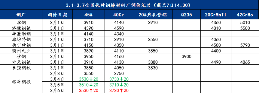 Mysteel快讯:全国优特钢棒材钢厂调价汇总(3.1-3.7)
