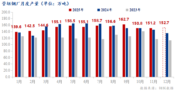 11月管坯钢厂实际生产151.19万吨,12月预计产量152.74万吨。