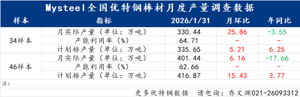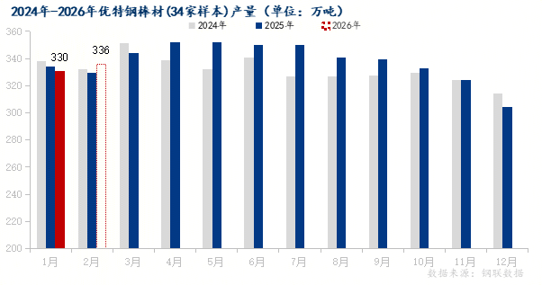 1月全国优特钢棒材(34家样本)产量330.44万吨,环比增加25.86万吨,同比减少3.55万吨;2月预计产量335.65万吨,环比增加5.21万吨,同比增加6.25万吨。