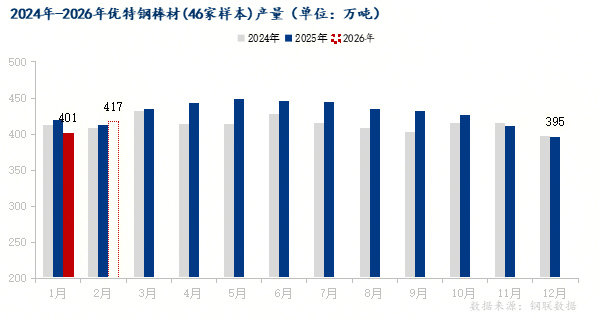 1月全国优特钢棒材(46家样本)产量401.44万吨,环比增加6.16万吨,同比减少17.66万吨;2月预计产量416.87万吨,环比增加15.43万吨,同比增加3.77万吨。