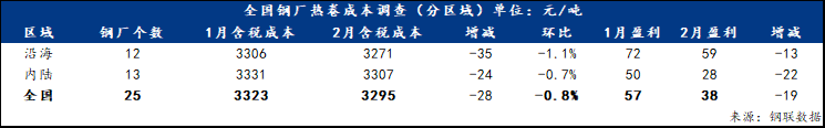 热卷方面,2月底对全国25家热轧板卷生产企业调研了解到,热卷平均成本为3295元/吨,环比减少28元/吨,降幅0.8%;分区域来看,沿海地区12家钢厂热卷平均成本为3271元/吨,环比减少35元/吨,降幅1.1%;内陆地区13家钢厂热卷平均成本为3307元/吨,环比减少24元/吨,降幅0.7%;盈利空间方面,2月份热卷生产企业盈利38元/吨,盈利环比减少19元/吨。