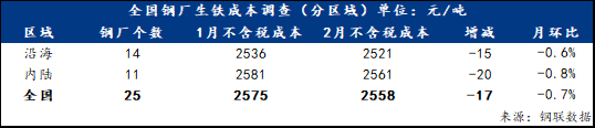 2月底对25家高炉炼铁企业的调研了解,目前铁水不含税成本为2558元/吨,环比减少17元/吨,降幅0.7%。分区域来看,沿海地区钢厂铁水不含税成本为2521元/吨,环比减少15元/吨,降幅0.6%;内陆地区钢厂铁水成本为2561元/吨,环比减少20元/吨,环比减少0.8%。
