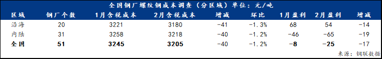 螺纹钢方面,2月底对全国51家螺纹钢生产企业调研了解到,螺纹钢平均成本为3205元/吨,环比下降40元/吨,降幅1.2%;分区域来看,沿海地区20家钢厂螺纹钢平均成本为3180元/吨,环比减少41元/吨,降1.3%;内陆地区31家钢厂螺纹钢平均成本为3218元/吨,环比减少40元/吨,降幅1.2%;盈利空间方面,2月份螺纹钢生产企业盈利空间在-25元/吨,环比减少17元/吨。