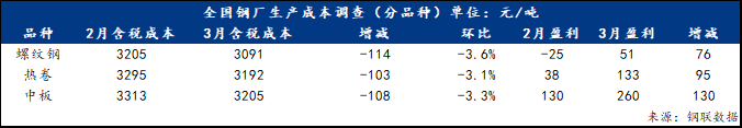 Mysteel调查的全国91家高炉钢厂,3月底螺纹钢平均含税成本为3091元/吨,环比下跌114元/吨,跌幅3.6%,盈利51元/吨,增加76元/吨;热卷为3192元/吨,环比减少103元/吨,跌幅3.1%,盈利133元/吨,增加95元/吨;中厚板为3205元/吨,环比减少108元/吨,降幅3.3%,盈利260元/吨,增加130元/吨。