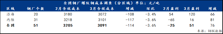 螺纹钢方面,3月底对全国51家螺纹钢生产企业调研了解到,螺纹钢平均成本为3091元/吨,环比下降114元/吨,降幅3.6%;分区域来看,沿海地区20家钢厂螺纹钢平均成本为3072元/吨,环比减少108元/吨,降3.4%;内陆地区31家钢厂螺纹钢平均成本为3101元/吨,环比减少117元/吨,降幅3.6%;盈利空间方面,3月份螺纹钢生产企业盈利空间在51元/吨,环比增加76元/吨。