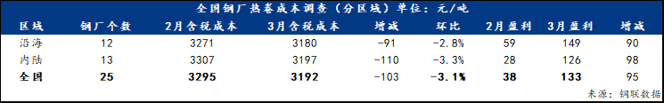 热卷方面,3月底对全国25家热轧板卷生产企业调研了解到,热卷平均成本为3192元/吨,环比减少103元/吨,降幅3.1%;分区域来看,沿海地区12家钢厂热卷平均成本为3180元/吨,环比减少91元/吨,降幅2.8%;内陆地区13家钢厂热卷平均成本为3197元/吨,环比减少110元/吨,降幅3.3%;盈利空间方面,3月份热卷生产企业盈利133元/吨,盈利环比增加95元/吨。