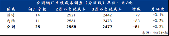 3月底对25家高炉炼铁企业的调研了解,目前铁水不含税成本为2477元/吨,环比减少81元/吨,降幅3.2%。分区域来看,沿海地区钢厂铁水不含税成本为2442元/吨,环比减少79元/吨,降幅3.1%;内陆地区钢厂铁水成本为2478元/吨,环比减少83元/吨,环比减少3.2%。